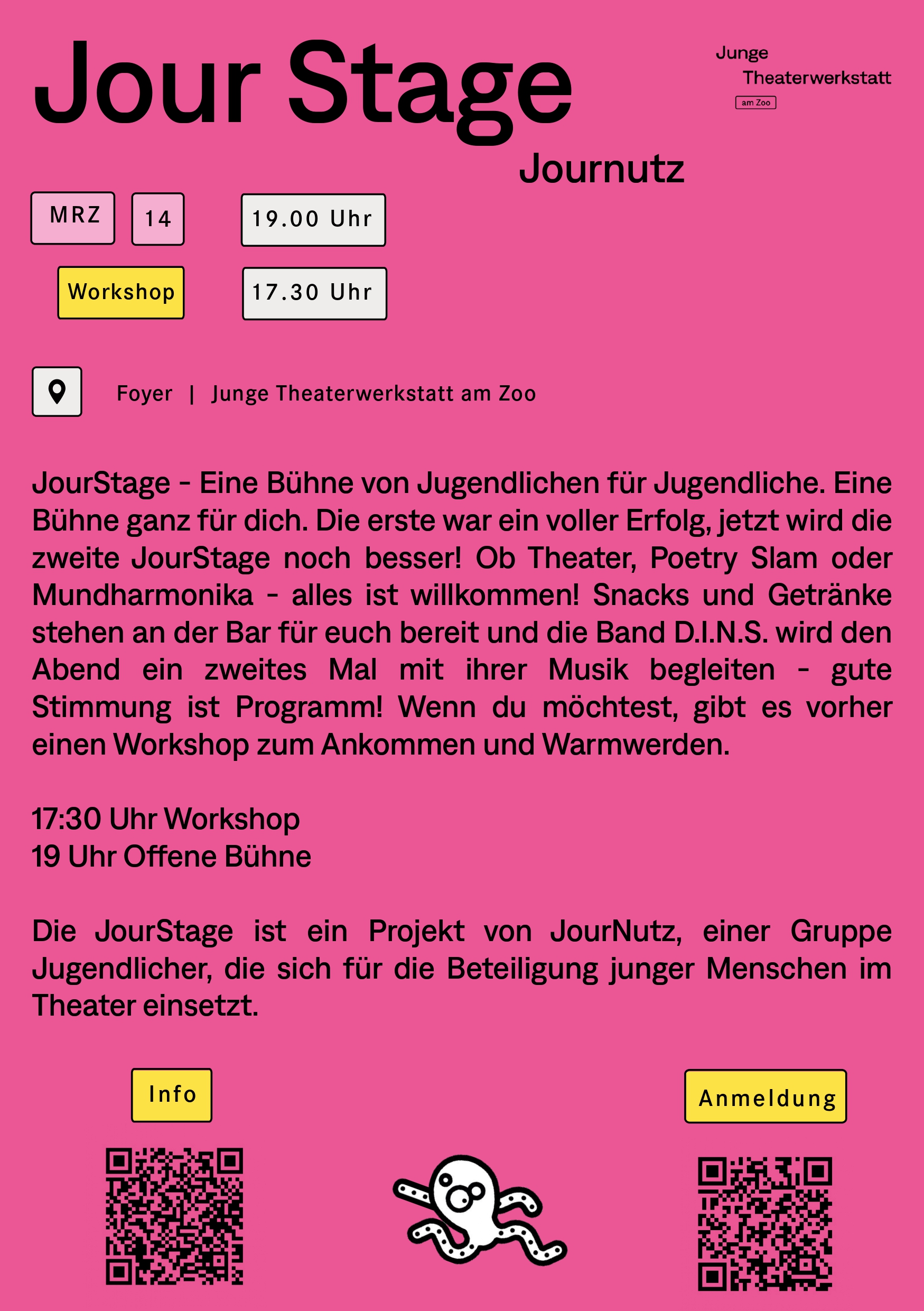 Die erste war ein voller Erfolg, jetzt wird die zweite JourStage am 14. März noch besser! Ob Theater, Poetry Slam oder Mundharmonika - alles ist willkommen. Snacks und Getränke stehen an der Bar für euch bereit und die Band D.I.N.S. wird den Abend erneut mit ihrer Musik begleiten - gute Stimmung ist Programm!